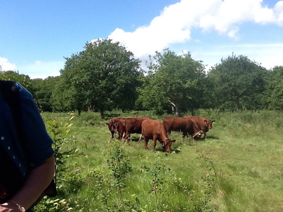 Here are some of the Forest’s English Longhorn Cattle, happily grazing. They wear collars to which the invisible fencing transmits warning messages not to cross the line.